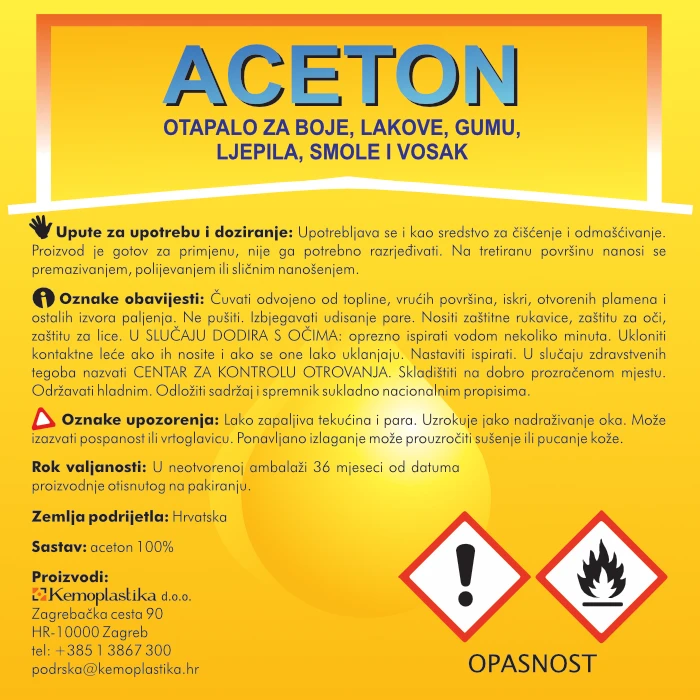Sukladno članku 5. stavku 2. Zakona o provedbi Uredbe (EU) 2019/1148 Europskog parlamenta i vijeća od 20. lipnja 2019. o stavljanju na tržište i uporabi prekursora eksploziva te izmjeni Uredbe (EZ) br. 1907/2006 i stavljanju izvan snage Uredbe (EU) br. 98/2013 (NN 34/21) dužni smo Vas obavijestiti da su nabava, uvođenje, posjedovanje ili uporaba acetona od strane pojedinačnih korisnika podložni obvezama prijave iz članka 9. Uredbe (EU) 2019/1148.